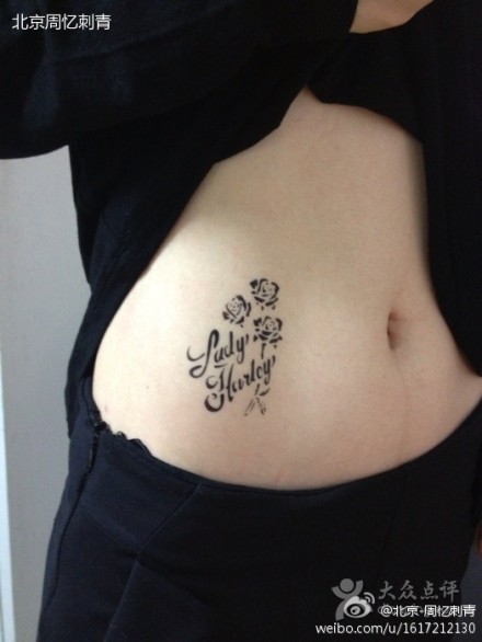 美女腹部潮流小巧的图腾玫瑰与字母纹身图案