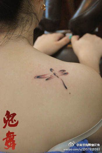 女生肩膀处小巧潮流的蜻蜓纹身图案