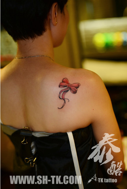 女生肩背小巧唯美的蝴蝶结纹身图案