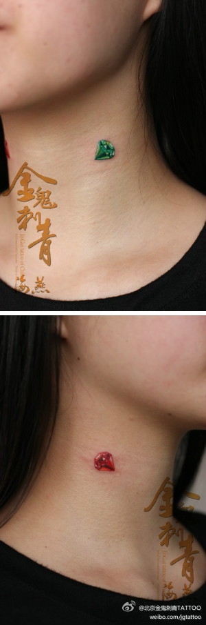 女生脖子处小巧时尚的彩色钻石纹身图案