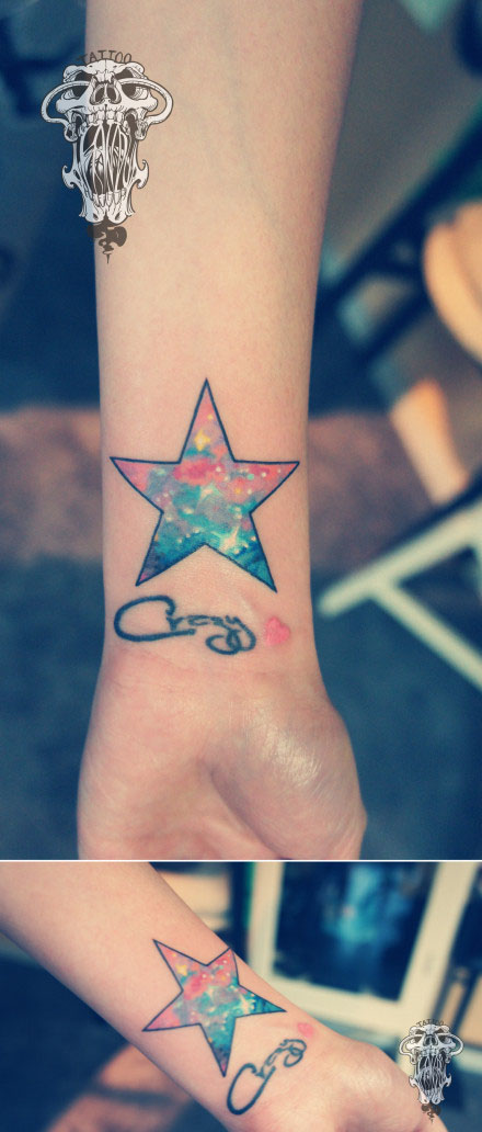 女生手腕小巧精美的彩色星空五角星纹身图案