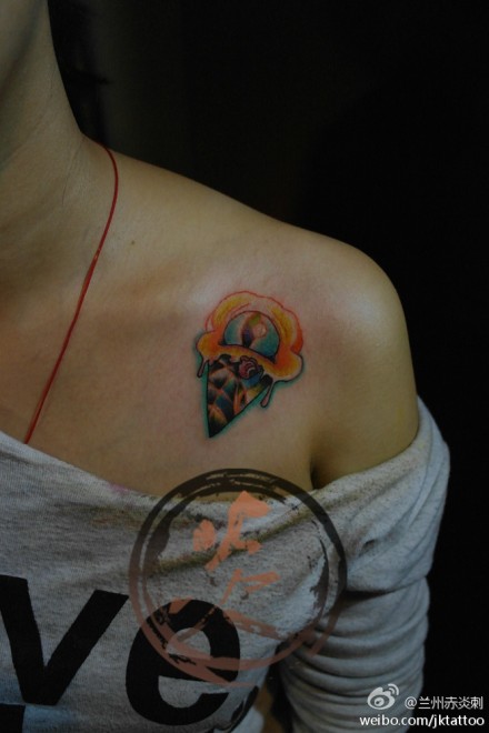 女生肩膀处小巧潮流的冰激凌纹身图案