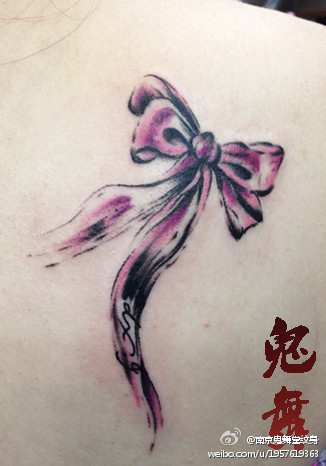 女生肩背唯美潮流的写意蝴蝶结纹身图案