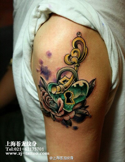 手臂好看的爱心锁与钥匙纹身图案