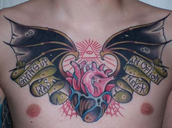 男人前胸超酷的old school心脏与翅膀纹身图案