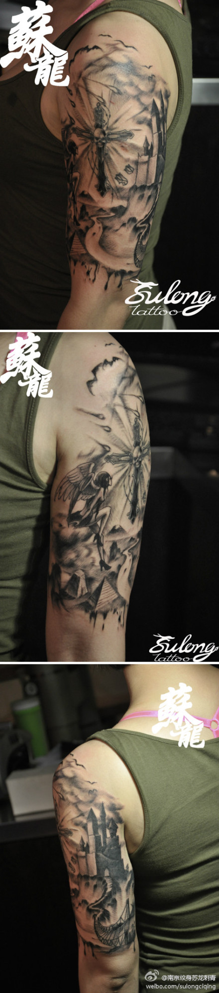 手臂帅气经典的天使与黑暗城堡纹身图案