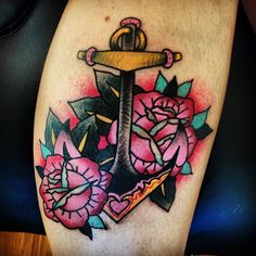分享一款彩色潮流的船锚玫瑰花纹身图案