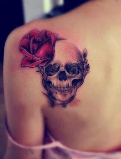 美女肩胛骨一款时尚潮流的骷髅玫瑰花纹身图案