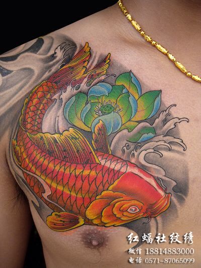 男人呢胸口一款霸气时尚的鲤鱼纹身图案
