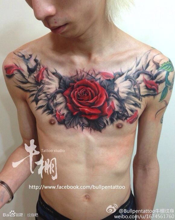 男人胸前一款霸气时尚的玫瑰花纹身图案