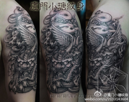 手臂潮流经典的一款黑灰貔貅纹身图案