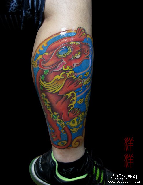 男人腿部超帅经典的彩色貔貅纹身图案