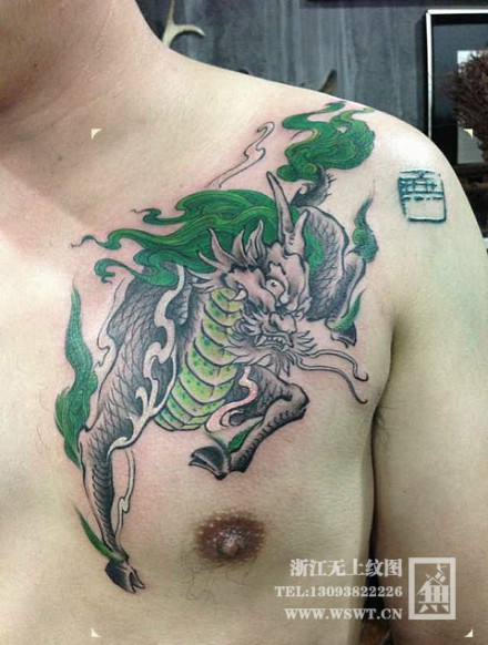 男生胸前时尚经典的麒麟纹身图案