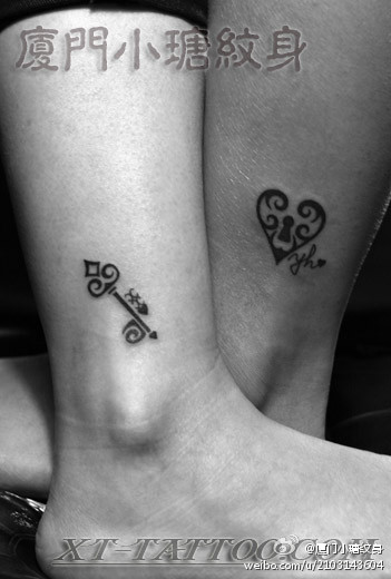 腿部时尚漂亮的情侣钥匙与爱心锁纹身图案