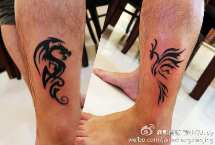 腿部时尚经典的情侣图腾龙与凤凰纹身图案