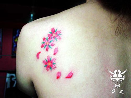 武汉专业老兵纹身店:美女后背樱花文身图案图片