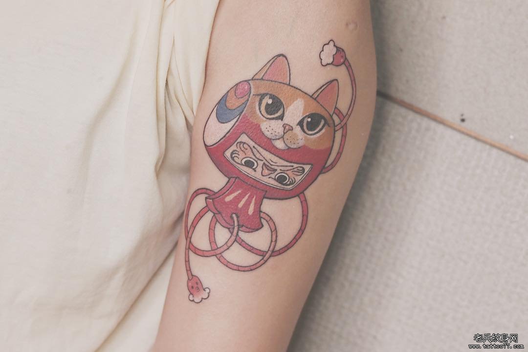 手臂彩色招财猫达摩福锤纹身图案