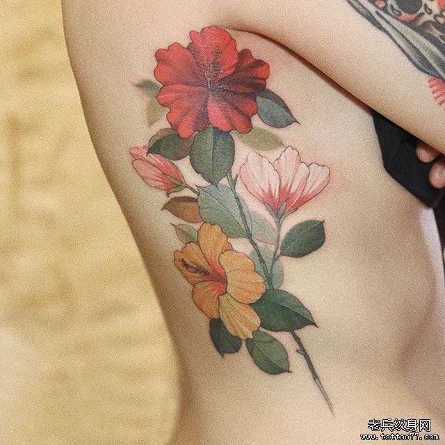 侧腰彩色花卉纹身图案