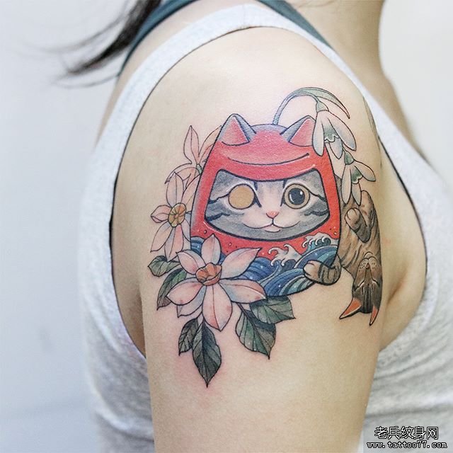 彩色日式达摩猫咪纹身图案
