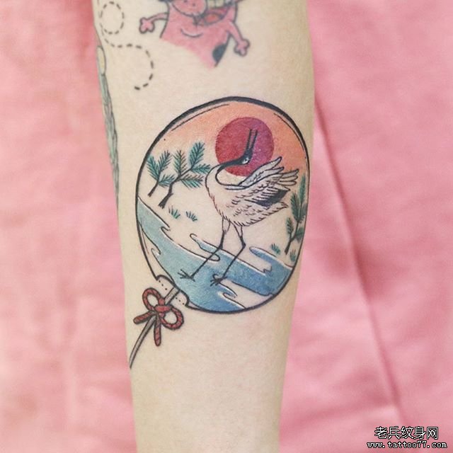 手臂彩色扇子仙鹤纹身图案