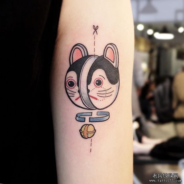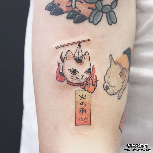 手臂彩色风铃招财猫纹身图案