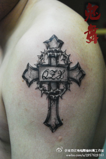 男生手臂经典的黑白十字架纹身图案