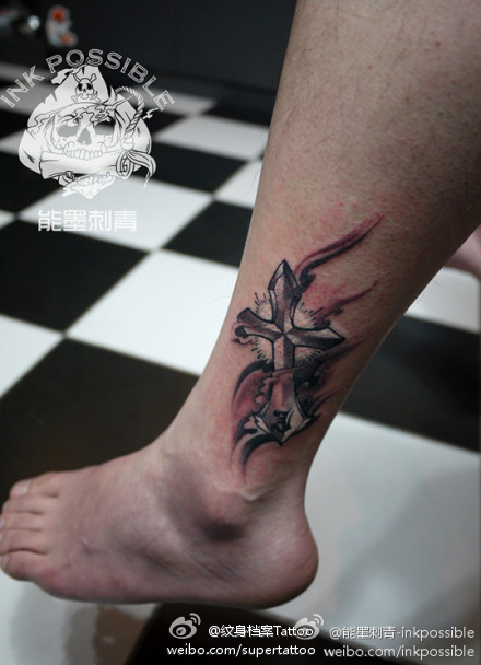 腿部时尚经典的十字架纹身图案