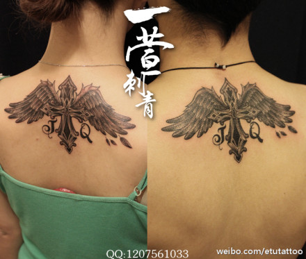 颈部潮流时尚的情侣十字架翅膀纹身图案