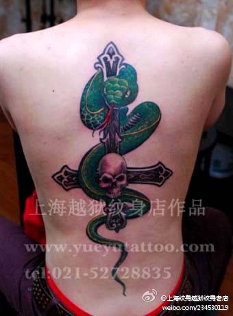 男生后背超酷经典的蛇十字架纹身图案