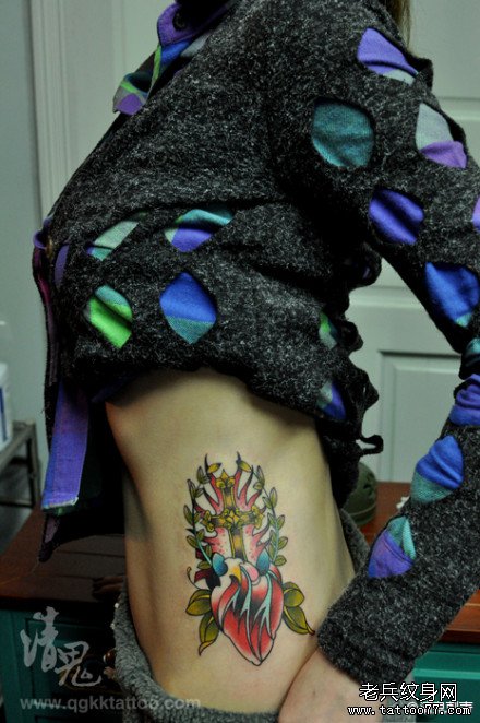 女生腰部潮流经典的十字架心脏纹身图案