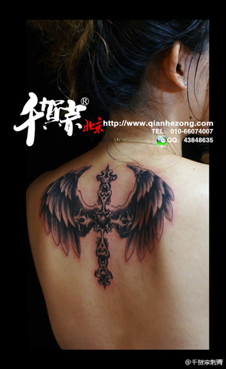 女生后背时尚潮流的十字架翅膀纹身图案