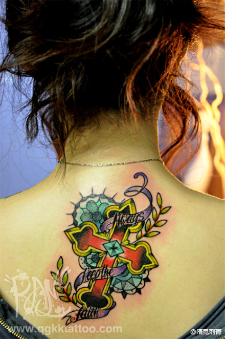 女生后背潮流时尚的十字架纹身图案