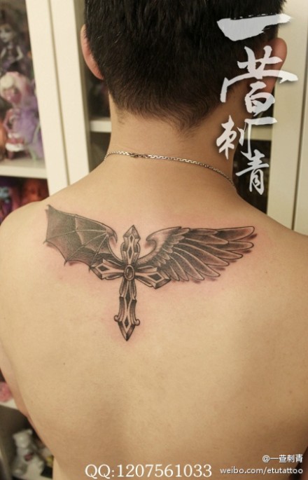 男生后背潮流精美的十字架翅膀纹身图案