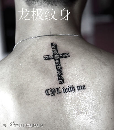 男生后脖子潮流时尚的十字架骷髅纹身图案