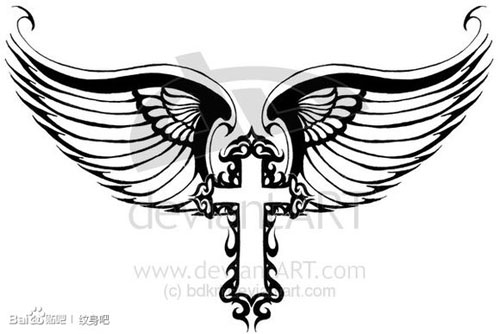 时尚很酷的一款图腾十字架翅膀纹身图案