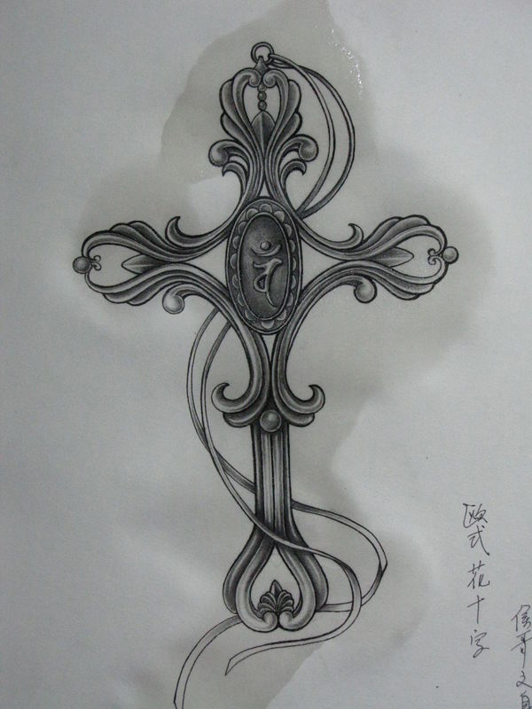 十字架纹身图案:黑白素描十字架纹身图案图片