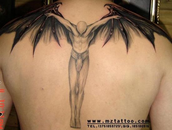 背部帅气的天使与恶魔翅膀纹身图案