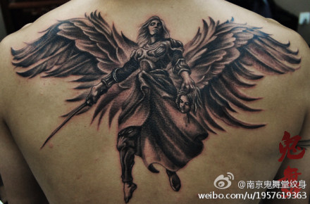 男生后背很酷时尚的黑灰天使纹身图案