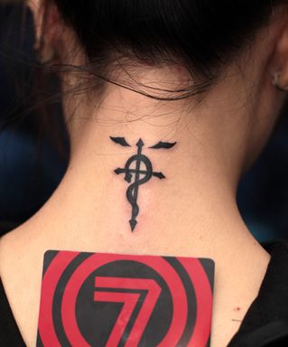 女孩子颈部图腾蛇十字架纹身图案