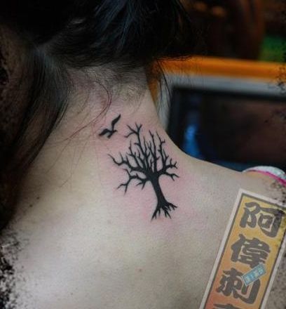 女孩子颈部时尚好看的图腾树小鸟纹身图案