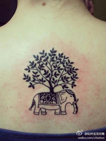 女生背部图腾小象与小树纹身图案