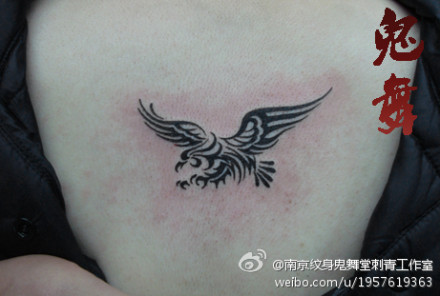女生背部小巧的图腾老鹰纹身图案