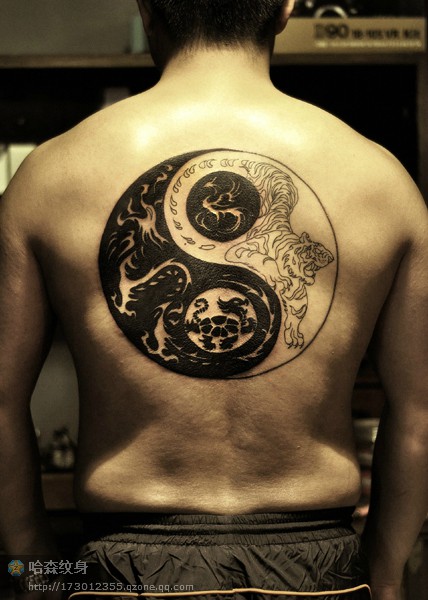 超酷的背部图腾八卦龙与老虎纹身图案