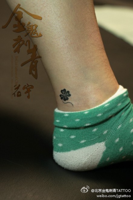 女生脚腕小巧的图腾四叶草纹身图案