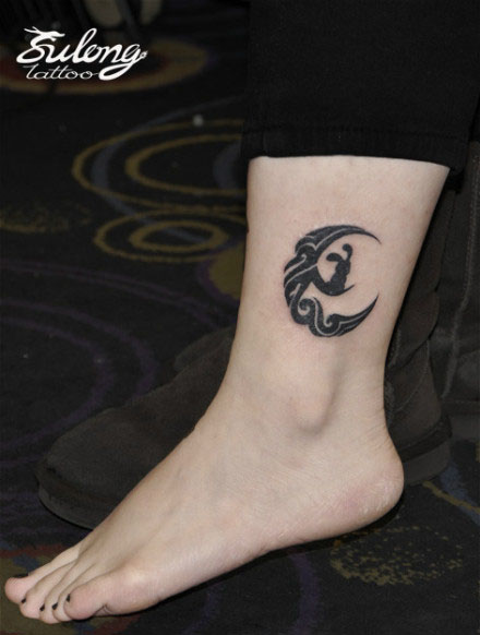 女生腿部小巧的图腾月亮与小兔子纹身图案