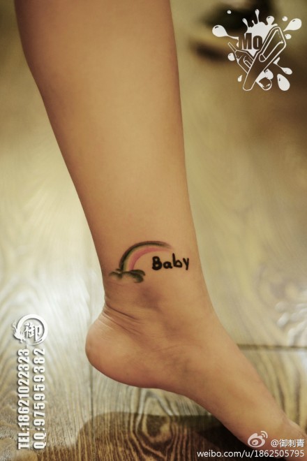 女生脚踝处小巧潮流的彩虹与字母纹身图案