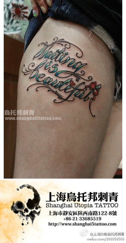 女生腿部潮流经典的花体字母纹身图案