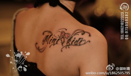 女孩子肩背唯美经典的花体字母与蝴蝶结纹身图案
