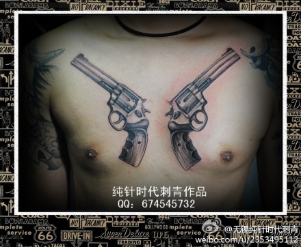 男人前胸经典时尚的手枪纹身图案