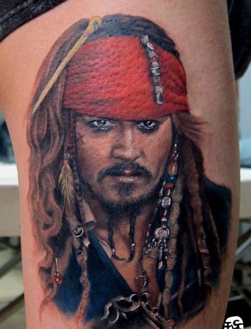 腿部一款加勒比海盗肖像纹身图案